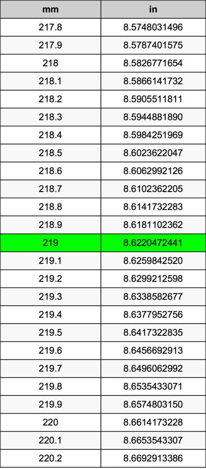 How much are 219 millimeters in inches?