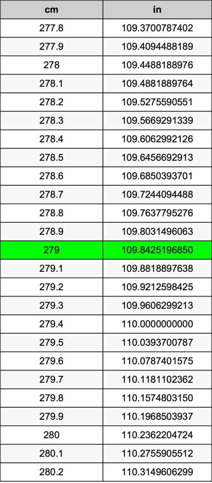 | 279 cm * | 0.3937007874 in | = 109.842519685 in |