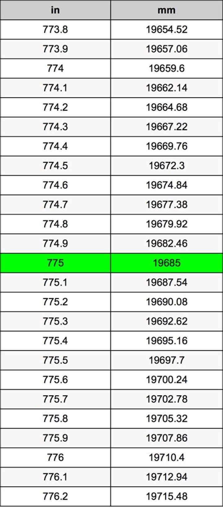 | 775 in * | 25.4 mm | = 19685.0 mm |