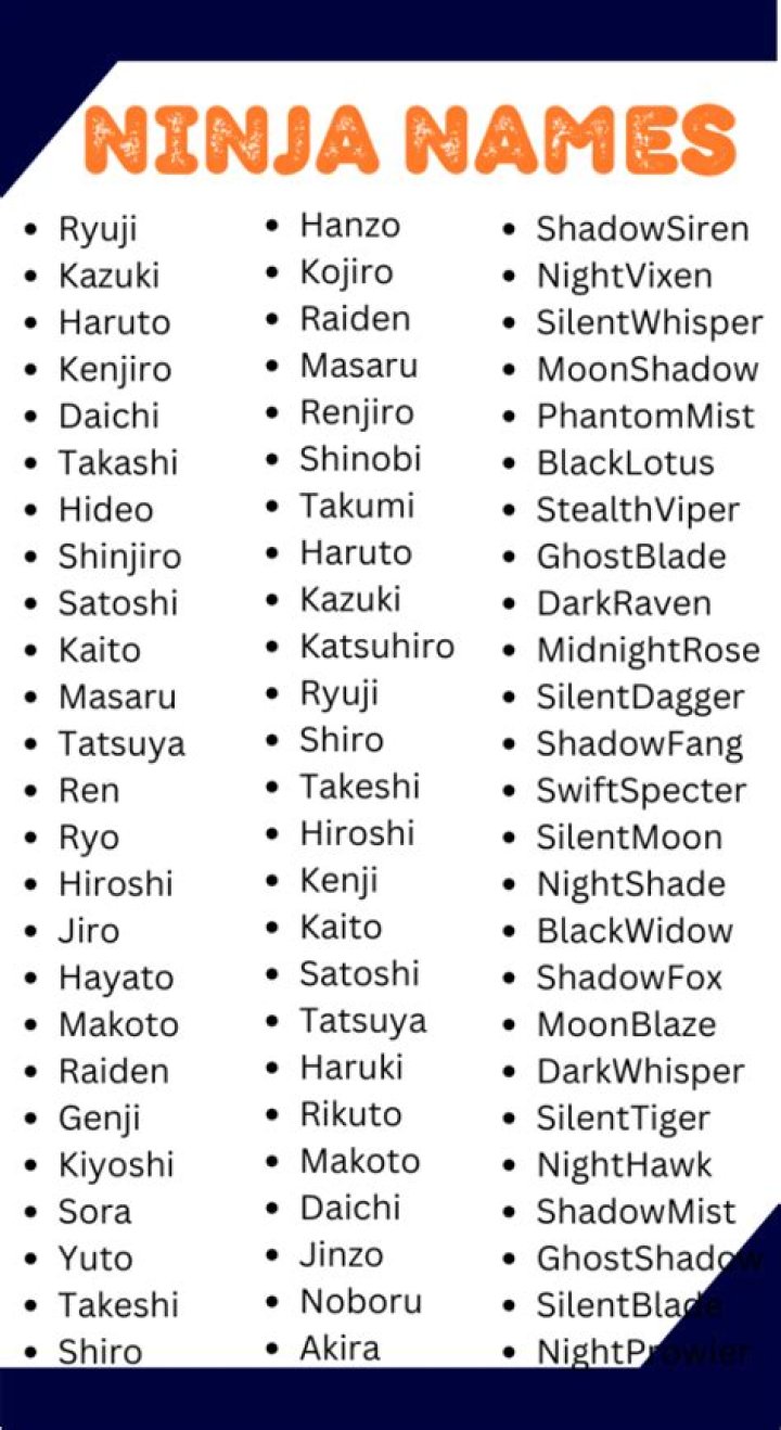 Names for ninjas are monikers given to individuals who practice the ancient Japanese martial art of ninjutsu.These names are often chosen for their symbolic meaning, representing the ninja's skills, values, or aspirations.Some common ninja names include: