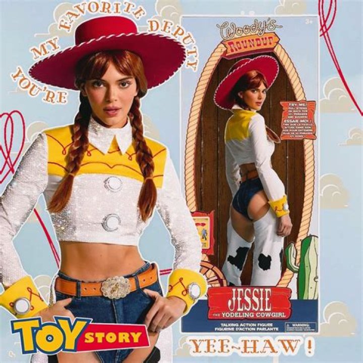 Kendall Jenner's Jessie costume is directly inspired by the character Jessie from the beloved Disney movie Toy Story. The costume captures Jessie's signature cowgirl attire, including her cowgirl hat, red and white polka dot shirt, denim shorts, and cowgirl boots.