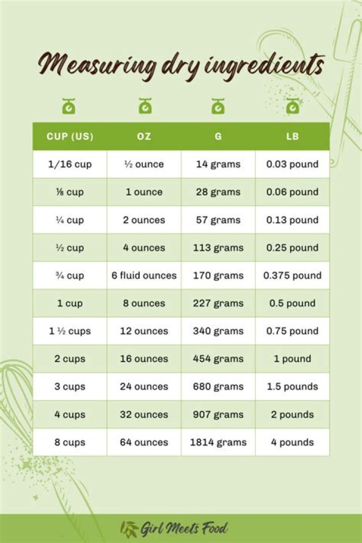 - Measurement and Conversion: This equation allows for direct conversion between the weight and volume of a dry ingredient. It is particularly useful when scaling recipes or adjusting ingredient quantities to ensure accurate proportions.