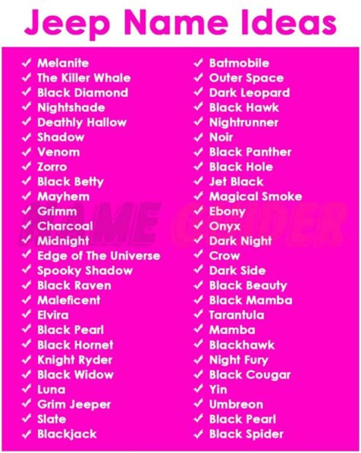 Finding the perfect jeep name for girls can be both exciting and challenging. Whether you're naming your vehicle, creating a character, or simply looking for inspiration, jeep names for girls offer endless possibilities. These names often reflect strength, adventure, and individuality, making them perfect for those who want something unique yet meaningful. In this article, we will explore a wide range of jeep names for girls that capture the essence of these qualities.